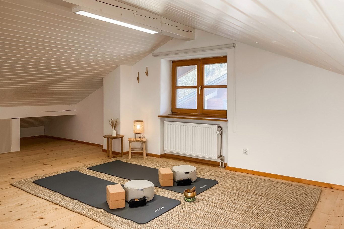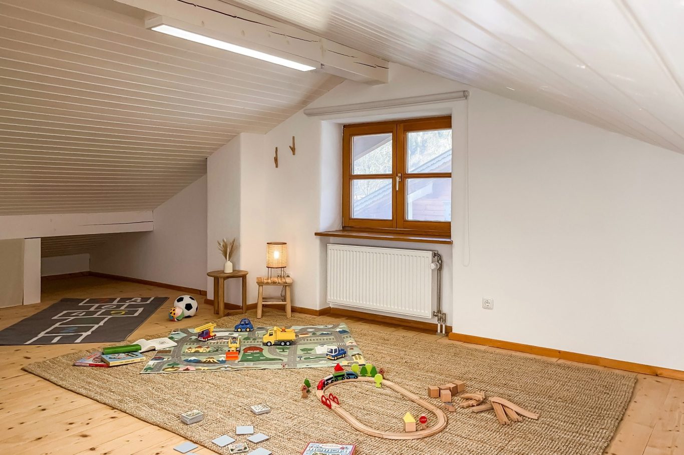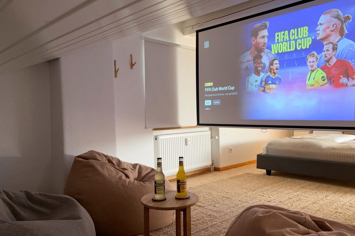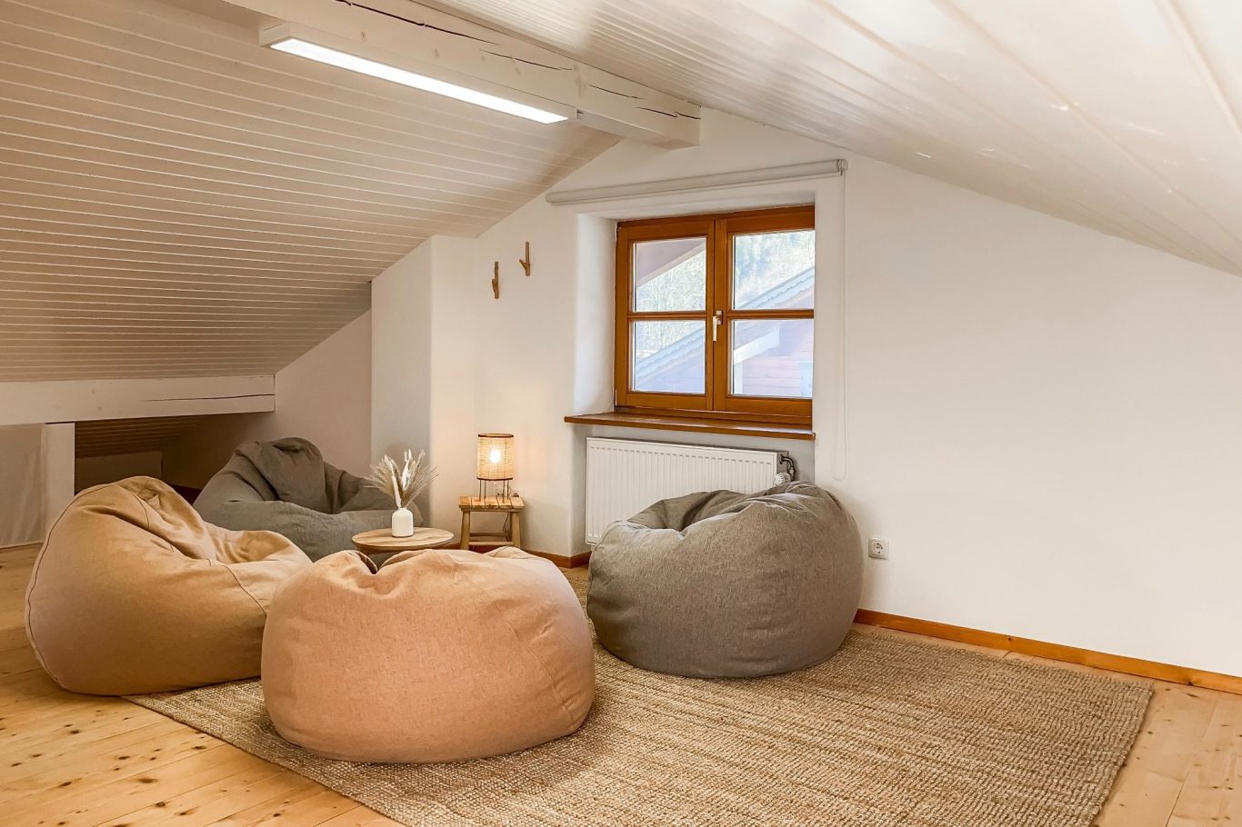Im Dachgeschoss wartet nicht nur ein gemütliches Kingsize-Bett auf Dich – tagsüber verwandelt sich der Raum ganz nach Deinen Wünschen: Starte mit unserem bereitgestellten Yoga-Equipment in den Tag, nutze den Schreibtisch für konzentriertes Arbeiten, richte mit unseren Turnmatten und Spielteppichen eine Spielwiese für Deine Kinder ein – oder mach es Dir in Deinem ganz persönlichen Heimkino mit Beamer und Leinwand gemütlich – unser Dachgeschoss passt sich Dir und Deinen Urlaubswünschen an.