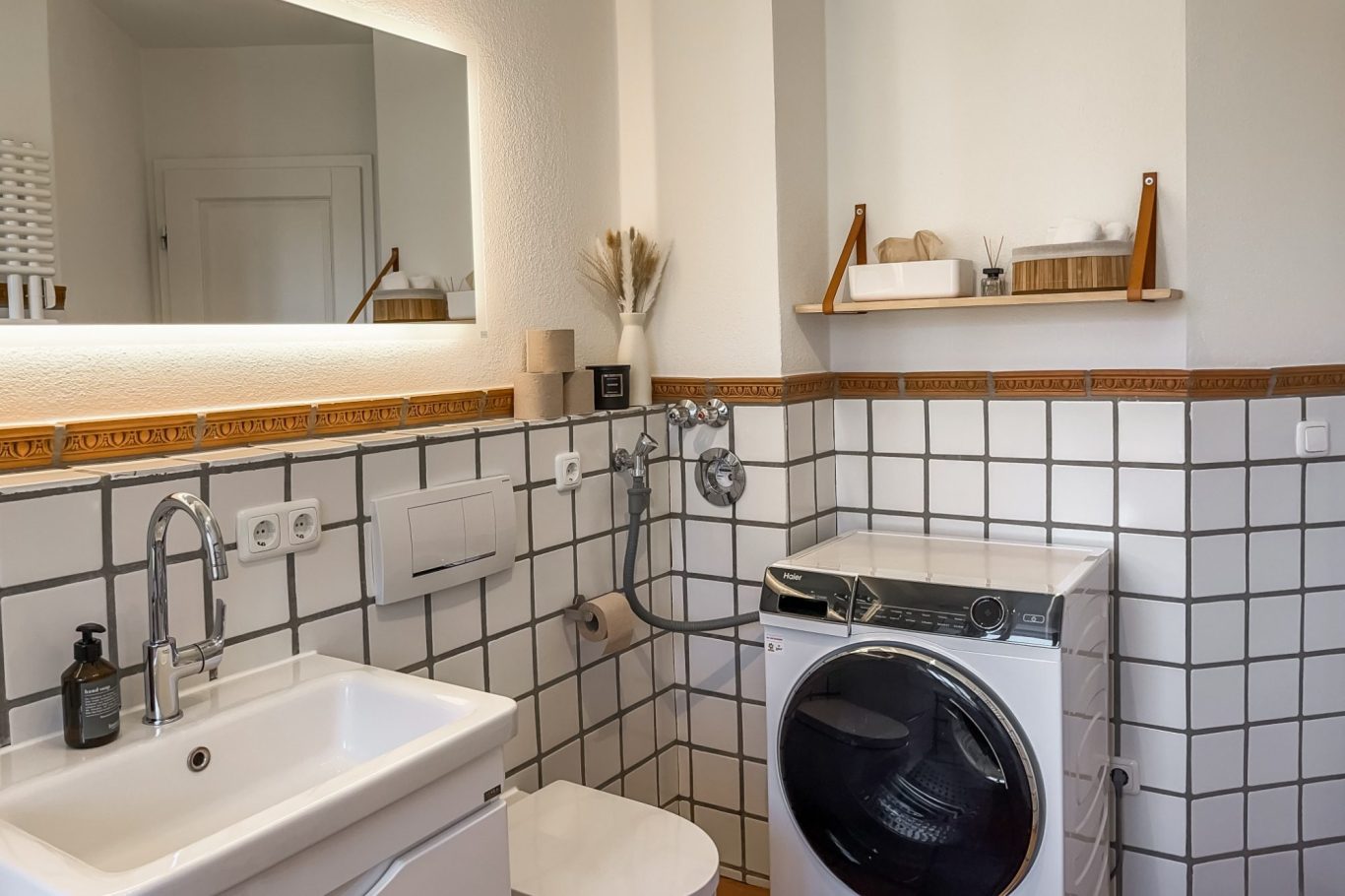 Das Badezimmer bietet Dir eine komfortable Badewanne mit Regendusche, in der Du Dich nach einem ereignisreichen Tag entspannen kannst. Neben frischen Handtüchern stellen wir Dir einen Haarföhn, Badezusätze, Seife, Duschgel, Shampoo und Conditioner zur Verfügung. Zudem erwartet Dich ein Waschtrockner mit dem Du Deine Wäsche waschen und trocknen kannst. Oder Du nutzt zum Trocknen Deiner Wäsche den bereitgestellten Wäscheständer.