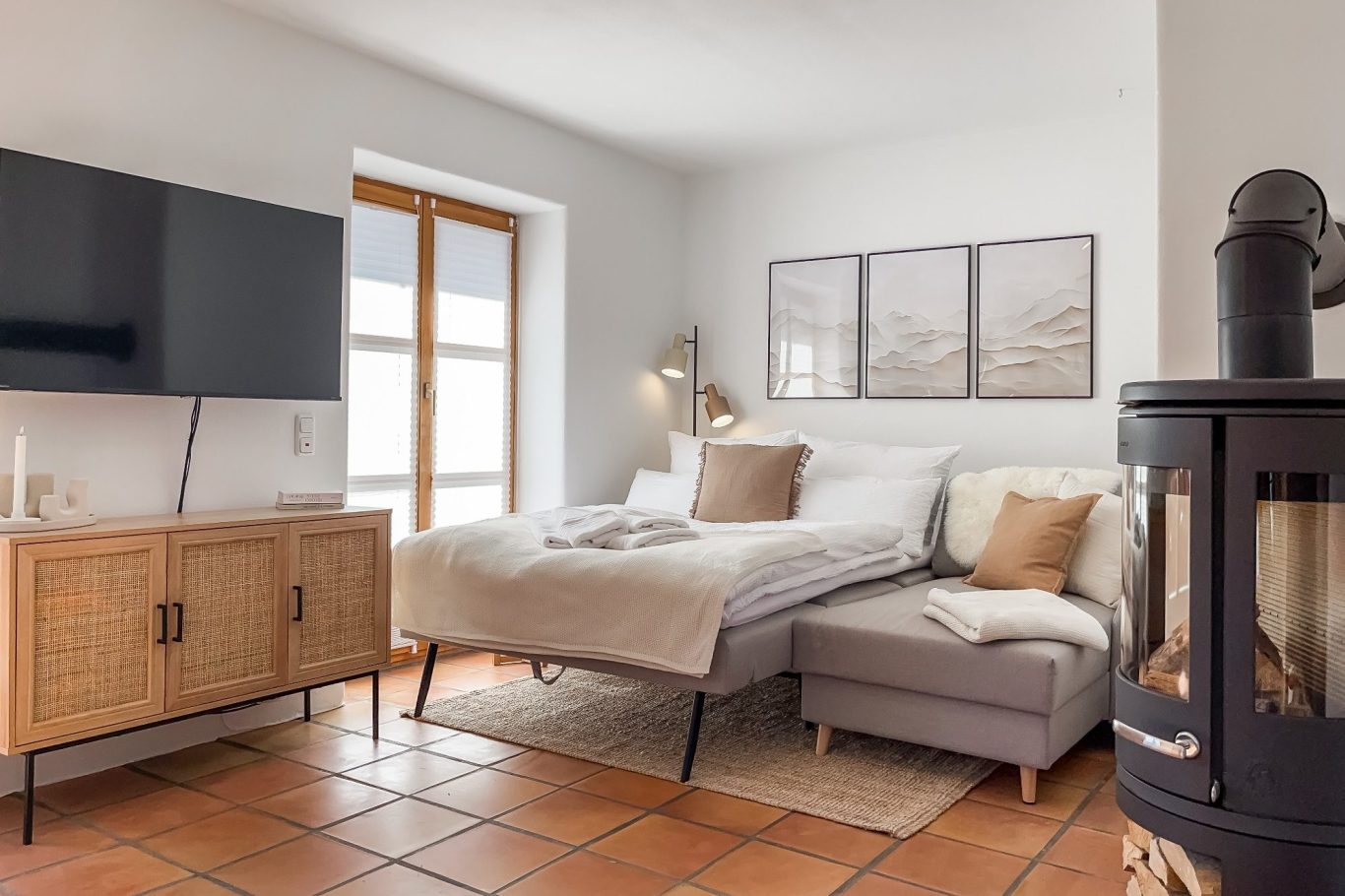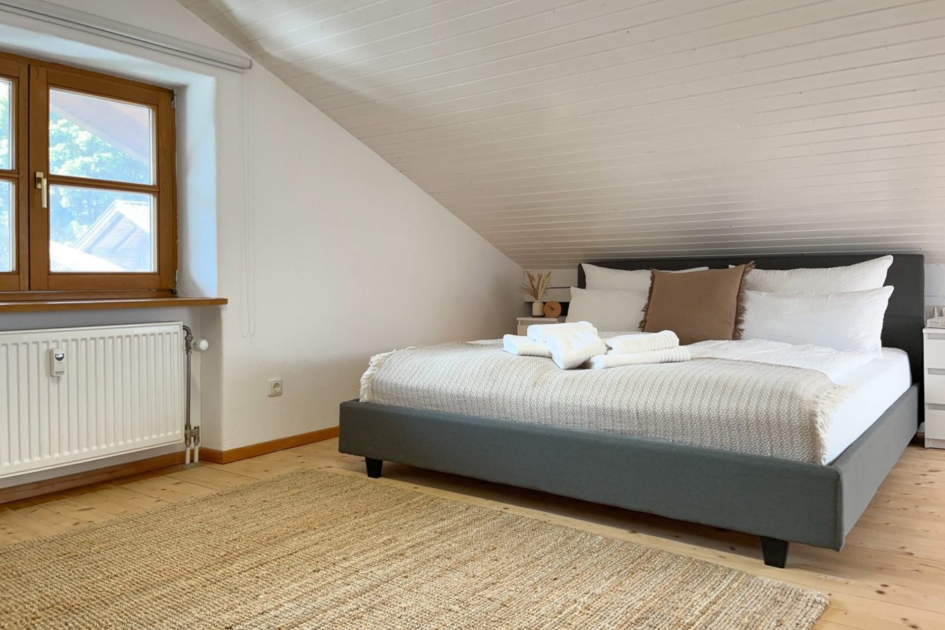 Im Dachgeschoss steht ein großzügiges Kingsize-Bett (180x200 cm) bereit – ein gemütlicher Rückzugsort mit ganz besonderer Atmosphäre unter dem Dach für zwei weitere Gäste. Das Schlafsofa im Wohnzimmer bietet mit einer Liegefläche von 140x200 cm und Boxspringkomfort einen erholsamen Schlaf für zwei zusätzliche Gäste. Die Bettwaren sind allergikerfreundlich und auf Hotelniveau.