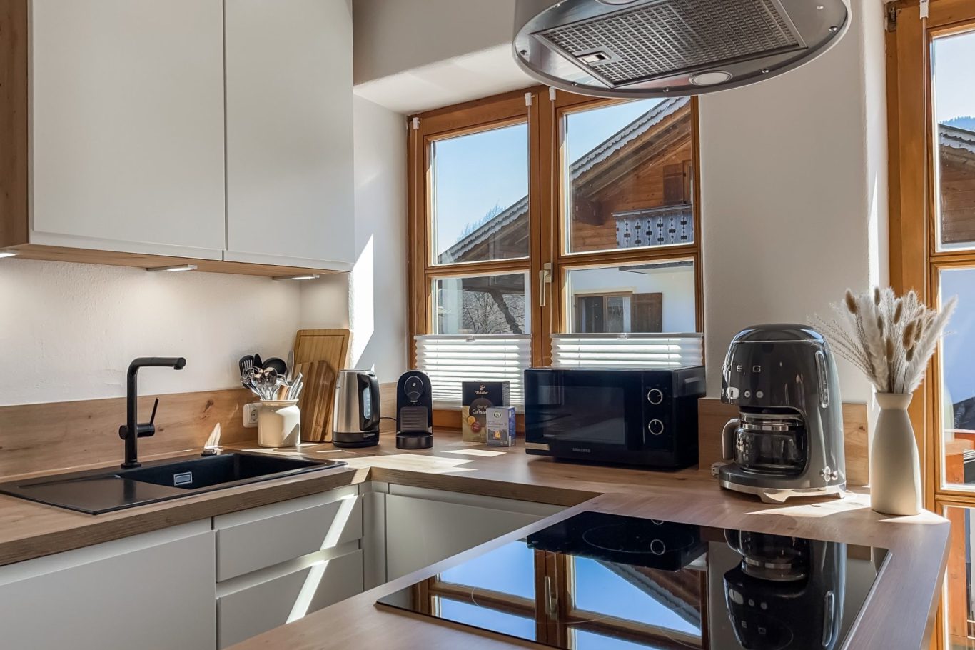In der voll ausgestatteten Küche mit Spülmaschine, Induktionskochfeld, Backofen, Mikrowelle, Kühlschrank, Toaster, Wasserkocher, Kapselkaffeemaschine sowie Filterkaffeemaschine findest Du alles, was Du zum Kochen brauchst.