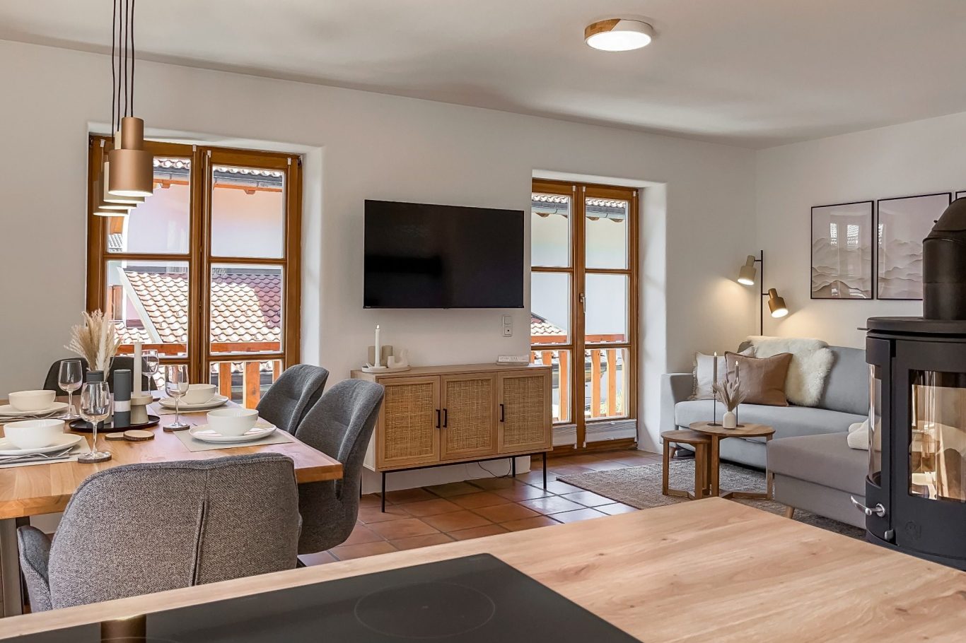 Der offene Wohn- und Essbereich lädt mit einem großzügigen Esstisch und bequemen Stühlen zu einem gemütlichen Beisammensein ein. Auf dem Sofa kannst Du entspannt die Füße hochlegen und bei einem knisternden Feuer im Kamin den Bergblick durch die zahlreichen Fenster genießen. Dank des individuell ausrichtbaren Smart-TV kannst Du vom Sofa, von der Essecke als auch von der Küche aus Serien und Filme schauen.