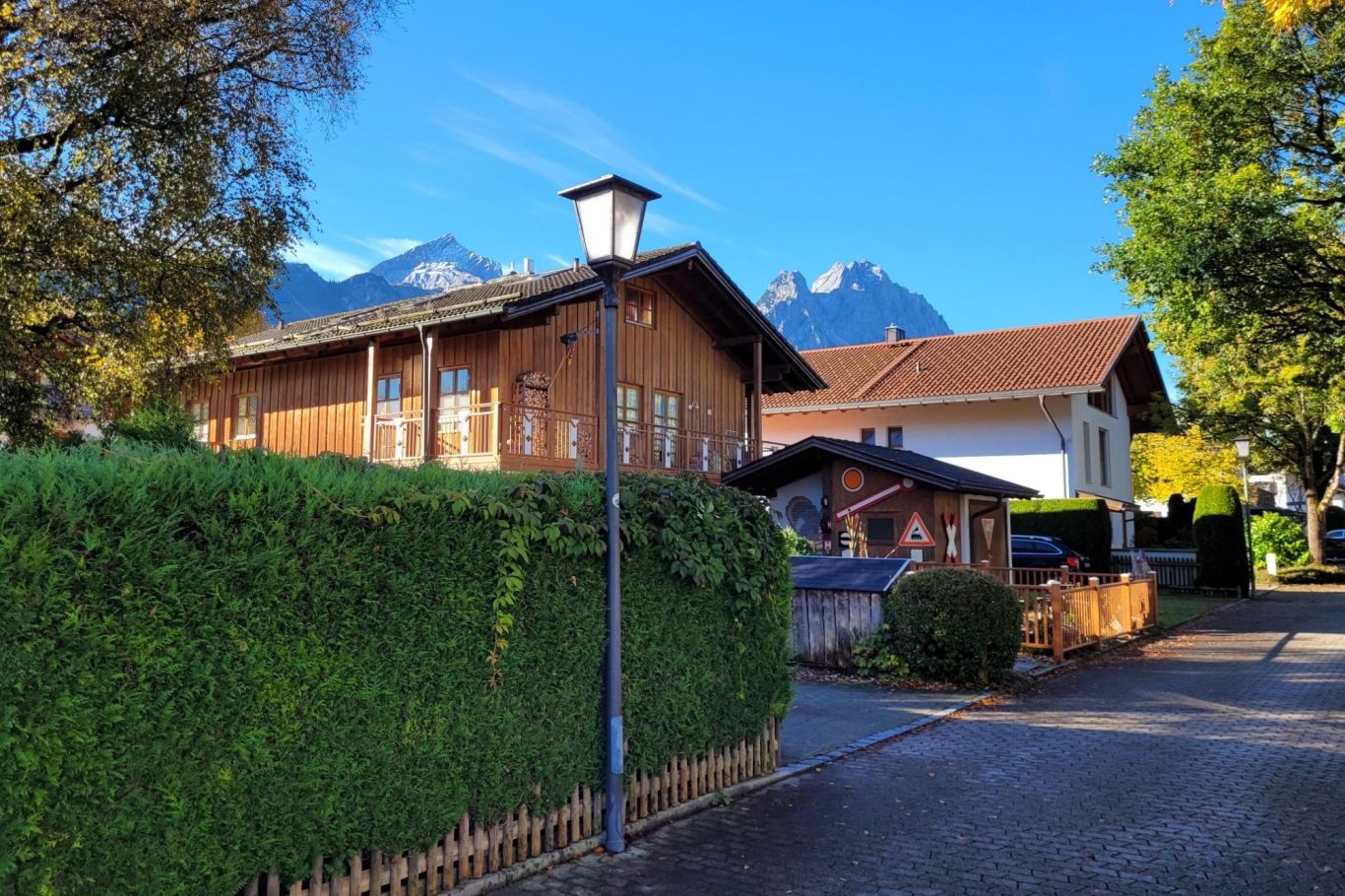 Du wohnst in einem Dreiparteienhaus in einer ruhigen Straße im Ortsteil Garmisch.